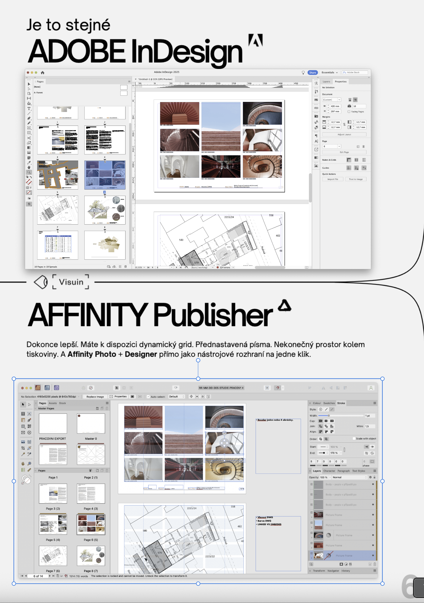 Protože Publisher ti přinese úsporu: jednorázová licence bez předplatného. Pro workflow architekta je navíc přímější – DWG, fotky a vizualizace v otevřených formátech vložíš přímo. Můžeš je i přímo v tiskovině editovat. Nemusíš otevírat další software. Adobe má své místo pro velká grafická studia, ale pro freelancery a menší týmy je Affinity velmi efektivní volba.